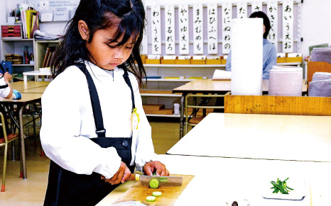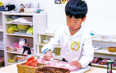 モンテッソーリの「⽇常⽣活練習」は、⼦どもが「机を拭く」「⽔を注ぐ」など⽇常的な活動を通して随意筋を思い通りに動かす、⾃分でできるという⾃信と⾃⽴が育ちます。