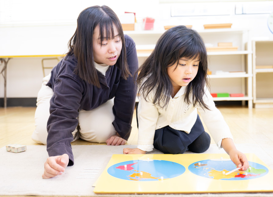 モンテッソーリの「文化教育」は子どもが「なぜ?どうして?」と感じる疑問に向き合いながら、地理や歴史などさまざまな分野を通して世界や宇宙への興味を広げていくことを大切にしています。